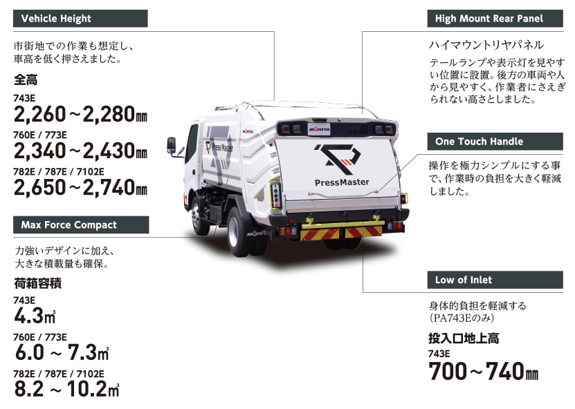 「プレスマスター®」は、ゴミ収集の効率化と負担軽減、安全性の改善を目指したプレス式塵芥収集車です。当社独自のハイマウントリアパネルに灯火器と表示器類を集約し、後方からの視認性を高め安全性を向上させたことに加え、作業者の負担軽減を図るため、投入口高さを約700mm以下に(※)設計することで作業性を向上させました。