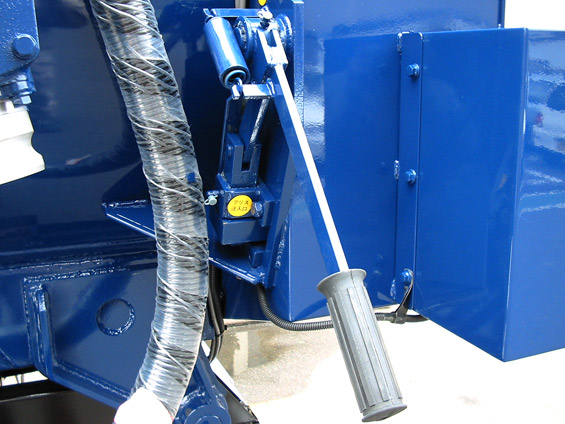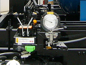 車を整地に停車させ、ギヤーポンプを回転させます。車両側方のスロットルレバーでギヤーポンプ回転を調整します。次にコントロールバルブ扉側レバーを「開」の位置にし、後部扉を開き、次にダンプ側レバーを「ダンプ」の位置にし、タンクを上昇させ、タンク内の沈殿物を排出させます。